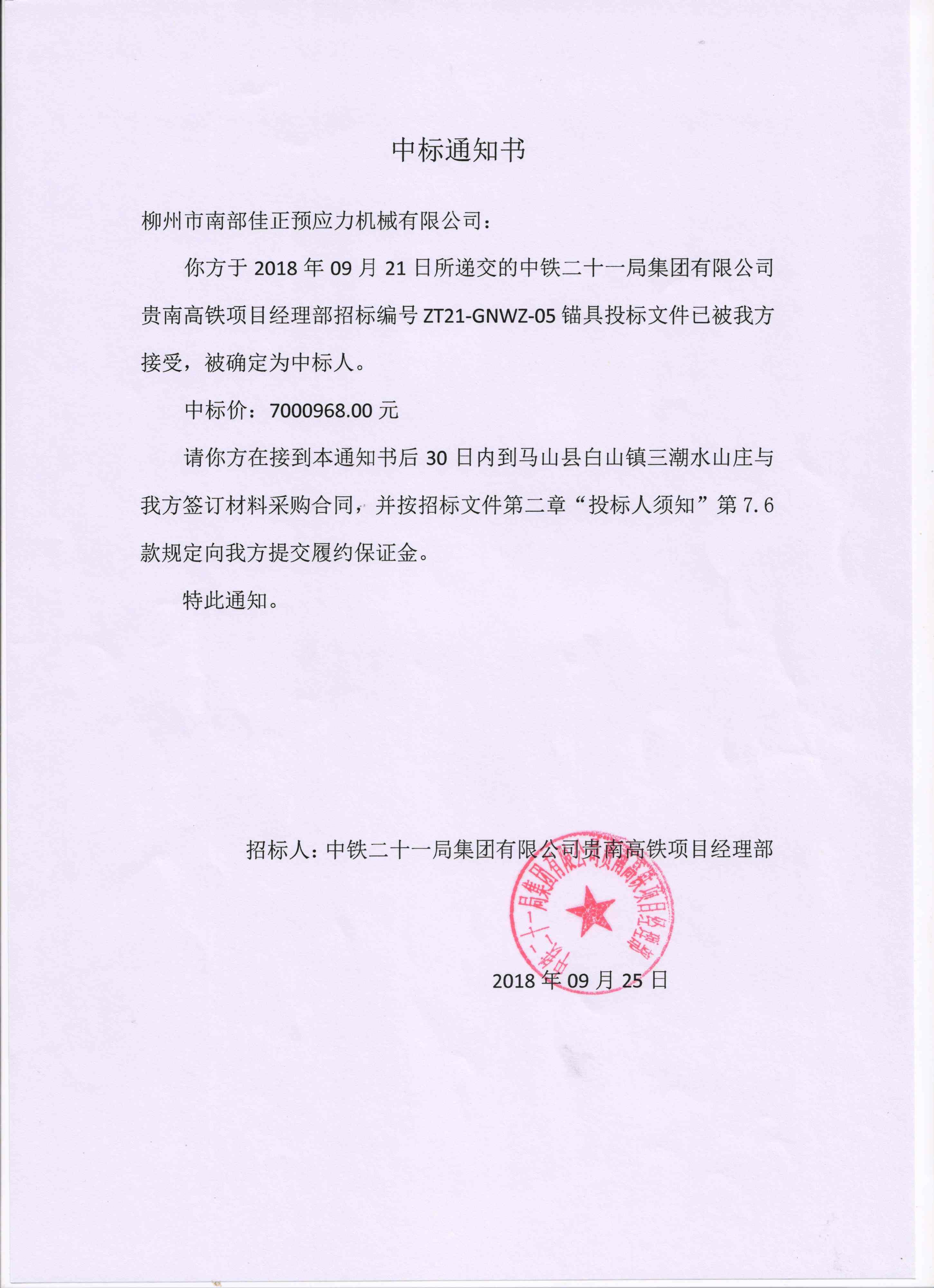 中鐵二十一局貴南鐵路中標(biāo)通知書