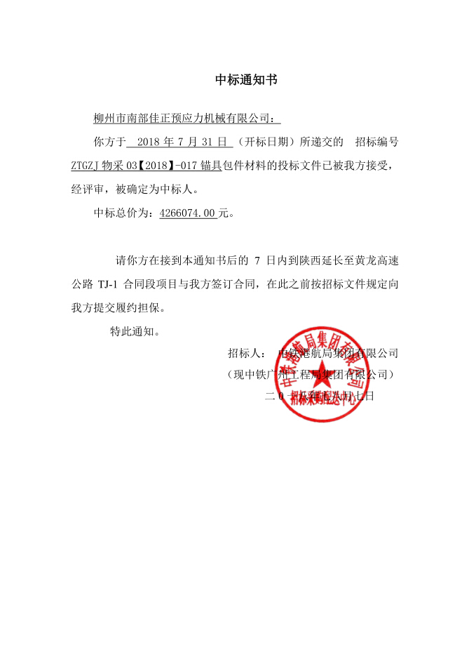 中鐵港航局三公司黃延中標通知